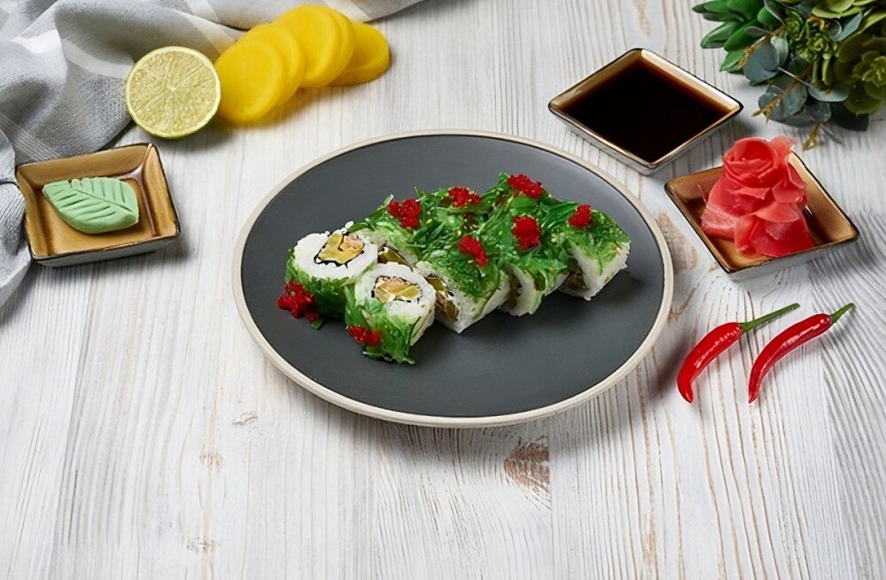 Курица, редька маринованная, сырный соус, салат чука, масаго, нори, рис