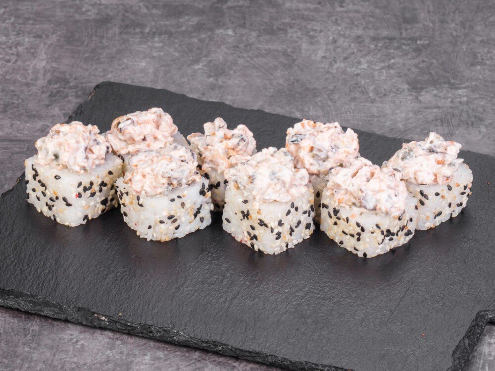 Мидии, огурцы, сыр сливочный, соус сырный, кунжут, нори, рис